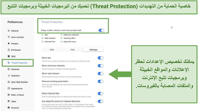 يمكنك تمكين أداء الحماية من التهديدات (Threat Protection) من لوحة إعدادات NordVPN