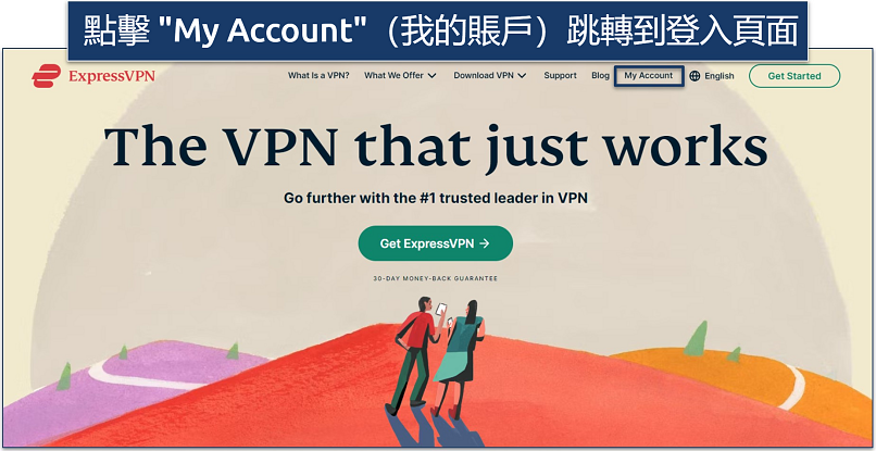 - 登入 ExpressVPN 賬戶。打開 ExpressVPN 官網首頁,在右上角找到並點擊 My Account(我的賬戶)。之後只需按照提示輸入電郵地址及密碼以登入。