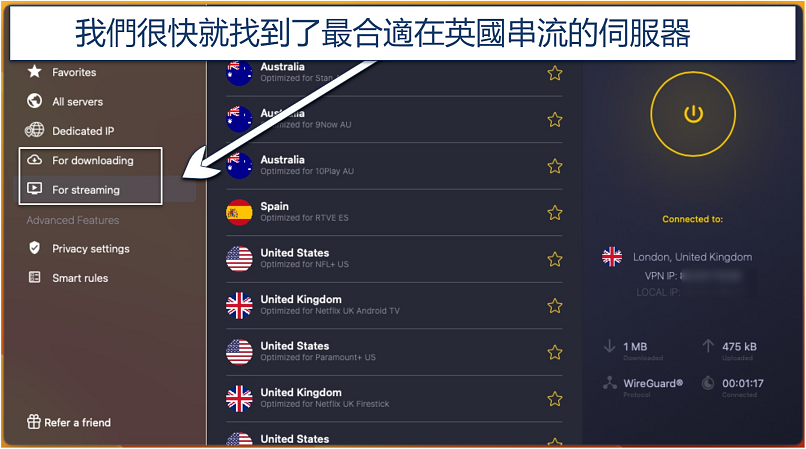 CyberGhost 具備龐大的伺服器網絡,速度很快。如果你想隨時隨地串流高清影片,它是很出色的選擇。不同於 NordVPN,CyberGhost 提供串流及種子傳輸專用伺服器。這些伺服器都經過專門優化。我們可以用相應的專用伺服器來串流 BBC iPlayer、Netflix 美國影片庫及 Disney+ 等熱門平台的內容。在我們的測試中,CyberGhost 的串流性能十分穩定。