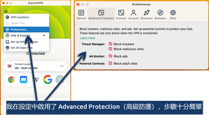 ExpressVPN 的私隱保護性能強大,提供自訂廣告、惡意軟體及追蹤器攔截功能。設定選項中有切換按鈕,你可以輕鬆啟用不同選項。它除了可以移除侵入性廣告,優化瀏覽體驗,更有家長控制選項,可屏蔽成人網站。