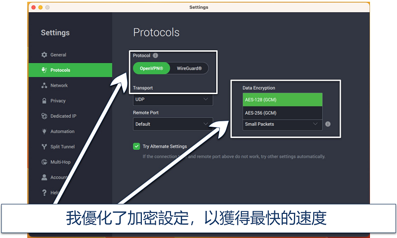 PIA 的自訂設定很豐富,用家可根據個人偏好進行優化使用體驗。可以選擇安全性更強的 256 位加密技術或速度更快的 128 位加密。如果你剛接觸 VPN,亦無需擔心設定很複雜。PIA 的默認選項就很好用,可以講是即裝即用。