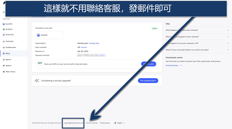 另一種方法是發送電郵來取消 NordVPN 賬戶。只需前往 NordVPN 官網,登入賬號,點擊底部的電郵地址:support@nordaccount.com。在郵件中說明你想要註銷賬戶以及相關原因(附上賬戶資訊及註銷原因會更高效)。