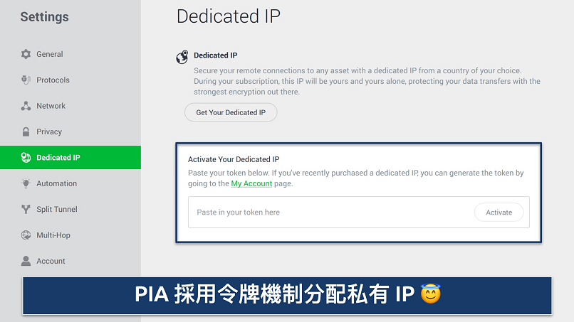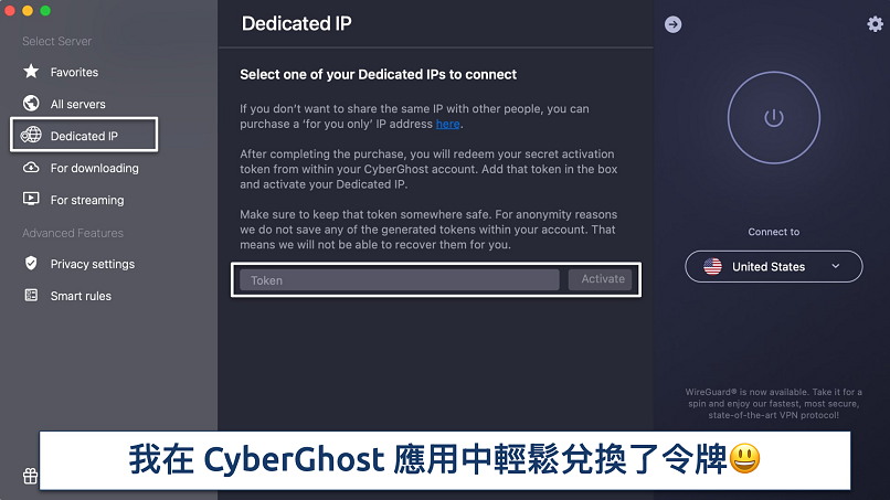 與 ExpressVPN 一樣,CyberGhost 採用基於令牌的專用 IP 系統,為用家提供最大限度的私隱保護。設定過程同樣簡單快捷,只需使用 CyberGhost 提供的令牌代碼兌換VPN 固定 IP 即可,毋須綁定個人賬戶。此功能運行穩定可靠,令我能私密地遠程存取公司網路。