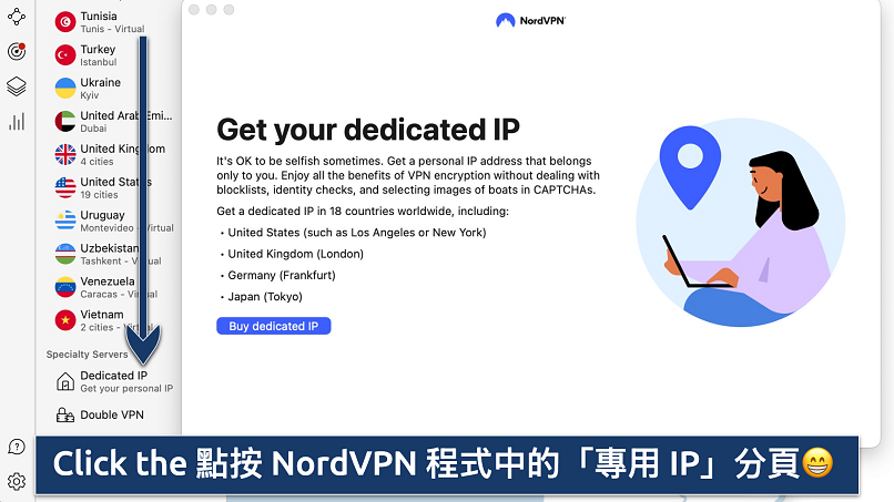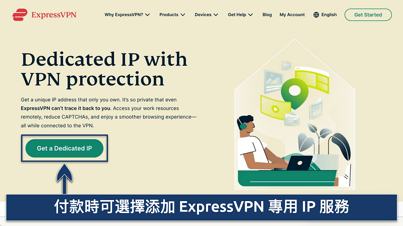 我最推薦 ExpressVPN。它的專用 IP 系統安全可靠,能保障連線安全。 - 申請獲取專用 IP。