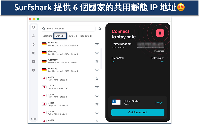 另外,與入圍的其他 VPN 不同,Surfshark 免費提供靜態 IP 地址。雖然這些 IP 地址需與其他用家共享,但對於沒那麼重要的使用場景(如避免人機驗證或銀行應用封鎖)仍是不錯的選擇。用家還可在全球多個區域伺服器之間自由切換。
